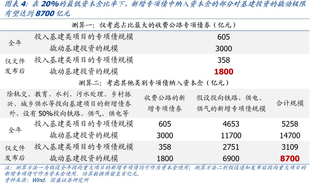 而从本次通知来看,允许使用新增专项债作为资本金的主要为国家重点支持的铁路、国家高速公路和支持推进国家重大战略的地方高速公路、供电、供气项目,这些项目的最低资本金比例均为20%。[5]这些项目的类别中,收费公路专项债占比较高,若仅考虑今年收费公路专项债券对基建投资的拉动作用,则全年约有605亿收费公路专项债券可纳入资本金,在20%的最低资本金比率下,约能撬动3000亿基建投资。[6]如果仅考虑通知下发之后的新增专项债才能作为资金本使用,则约有357亿收费公路专项债可作为资本金,约能撬动1800亿基建投资。
