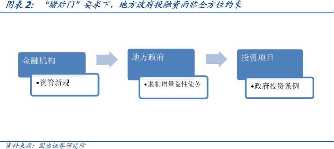 中长期:与2014-2015有所不同,本轮周期杠杆率的实质约束并未放松。抛开当前中国经济面临的短期问题,回到地方隐性债务的中长期框架,今年7月1日起政府投资条例将开始实施,从资金去向的角度约束地方政府投资端的权力。在融资、投资、隐性债务约束等一系列“堵后门”措施的推进下,资金压力从城投平台向地方政府传导。地方政府的资金要满足债务滚动、新增公益性项目融资和隐性债务化解,因而需要适当“开前门”保障重大项目合理融资需求,避免形成“半拉子”工程。